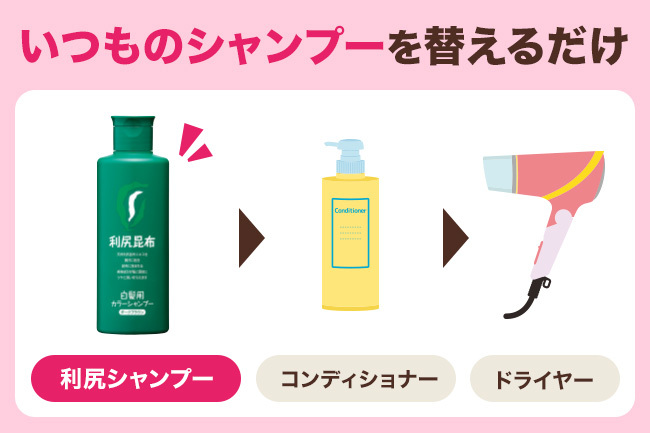 使い方は簡単で、いつものシャンプーを利尻カラーシャンプーに替えるだけ♪
